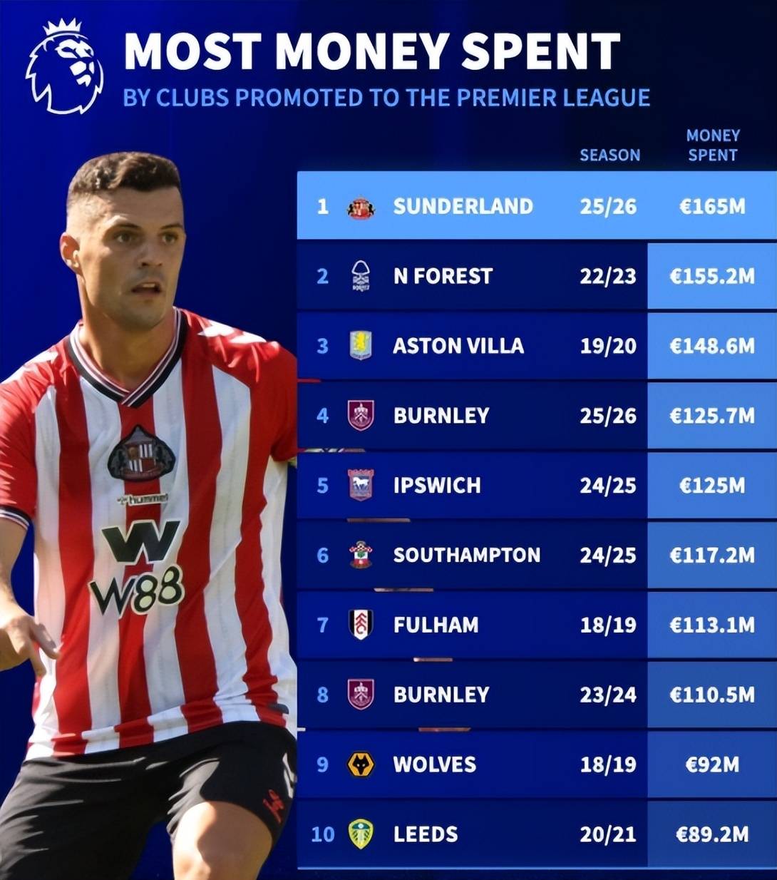 桑德兰的这场胜利,标志着他们在英超的崛起,绝不像外界所想象的那样轻松。面对英超中游球队西汉姆的挑战,桑德兰的表现十分出色,证明了他们并非“昙花一现”的新军。球队在此前引进了诸多实力派球员,其中包括曾在RB莱比锡和巴黎圣日耳曼效力的穆莱杰,他的加盟无疑增强了球队的整体竞争力。今年夏天,桑德兰共计引进了12名新球员,投资达到了惊人的1.65亿欧元,这一金额不仅在英超中排名第七,更在欧洲其他主要联赛中也占有一席之地,超过了意甲和西甲联赛的37支球队,这样的豪气令整个欧洲足坛瞩目。通过如此大手笔的引援投资,桑德兰已经超过了2022年夏窗的诺丁汉森林(1.55亿欧元),成为历史上购买力最强的升班马。这标志着他们在转会市场上的投入决心,表明了对英超生存的渴望及追求,他们不仅是在争夺名次,更是在为未来的成功奠定基础。根据以往的经验,英超的升班马要想在这个竞争激烈的联赛中完成保级,通常至少需要投资1.1亿欧元。而桑德兰本赛季的引援投入,不仅突破了这一“及格线”,更使他们拥有了成为保级热门的可能性。如果桑德兰希望打破近年来升班马全数降级的魔咒,他们不仅需要在场上奋勇争先超越其他来自英冠的对手,更要有能力将那些被视为“钉子户”的中游球队拖下马来。首战便以大胜西汉姆启动新赛季,是他们向保级目标迈进的一大步,接下来,他们必须继续保持这种势头,把胜利的信心不断延续下去。对于球迷来说,这无疑是一个充满希望的开始,桑德兰能否在英超赛场立足,值得期待。